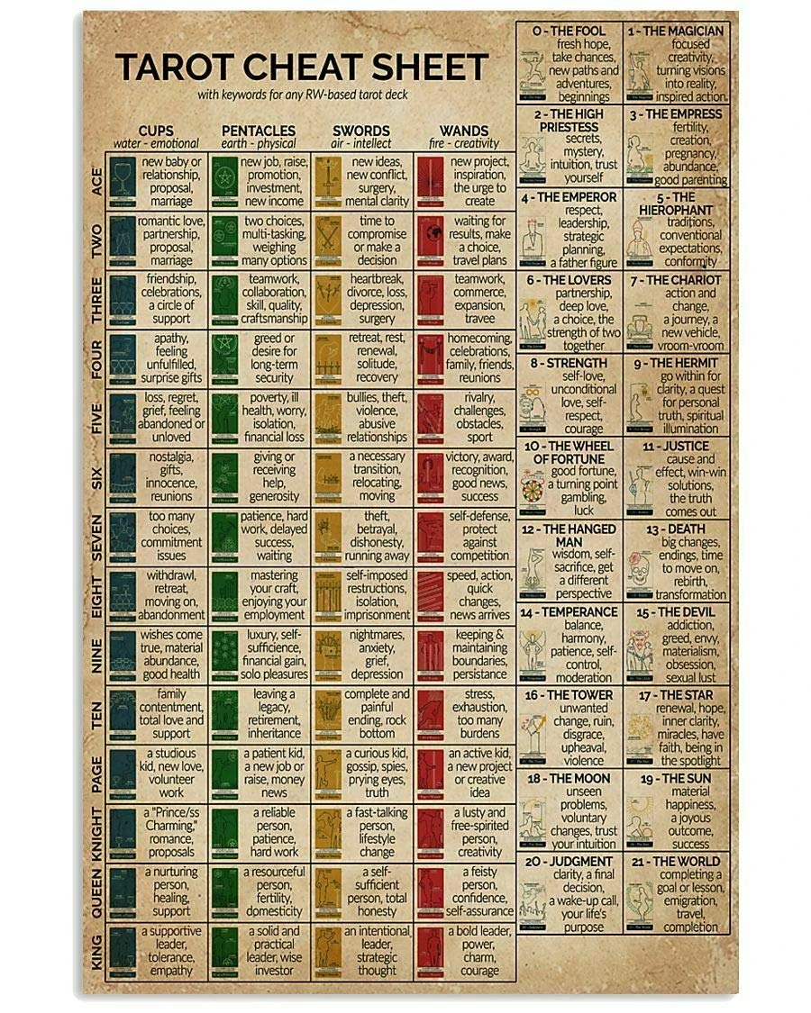 This listing is for a tarot cheat sheet for beginners and it comes in the following formats. The Cheat Sheet Includes. Download the Printable Tarot Meaning Cheat Sheets Major and Minor Arcana There are two versions to these tarot cheat sheets - a digital one in full color that you can reference here as.